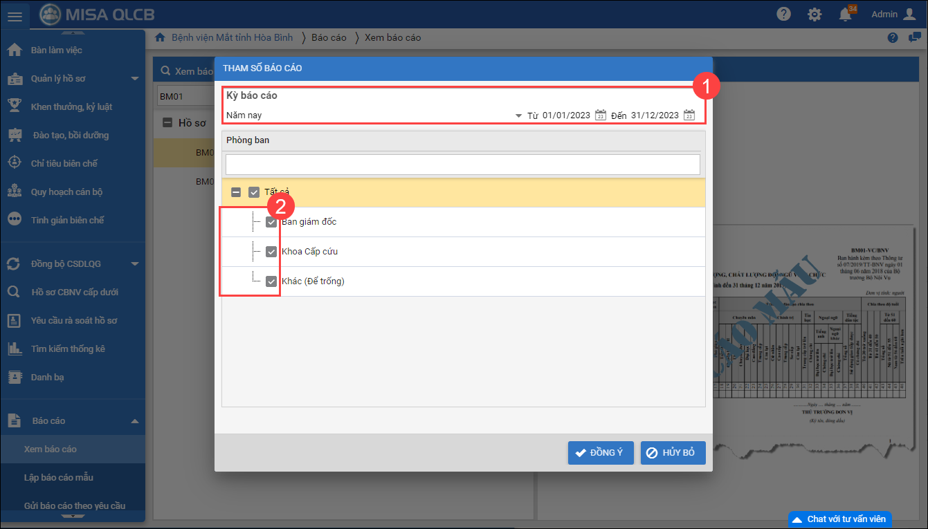 • Phòng ban: Tích chọn các phòng ban trong đơn vị cần thống kê số liệu.