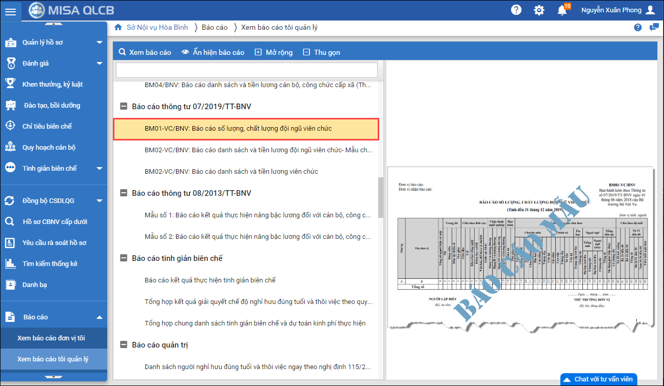 3. Tại nhóm Báo cáo TT 07/2019/TT-BNV, nhấn đúp chuột tại BM01-VC/BNV: Báo cáo số lượng, chất lượng đội ngũ viên chức.