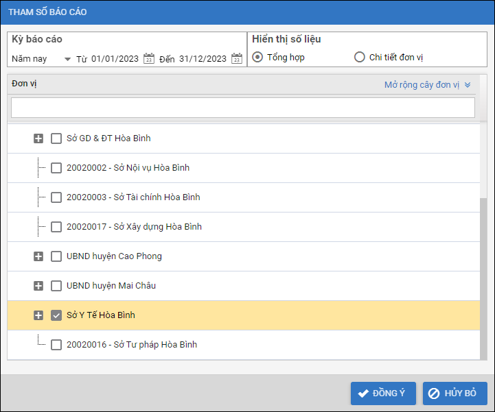 • Đơn vị: Tích chọn các đơn vị cần thống kê số liệu (Có thể chọn một, nhiều hoặc tất cả đơn vị trong cây đơn vị)