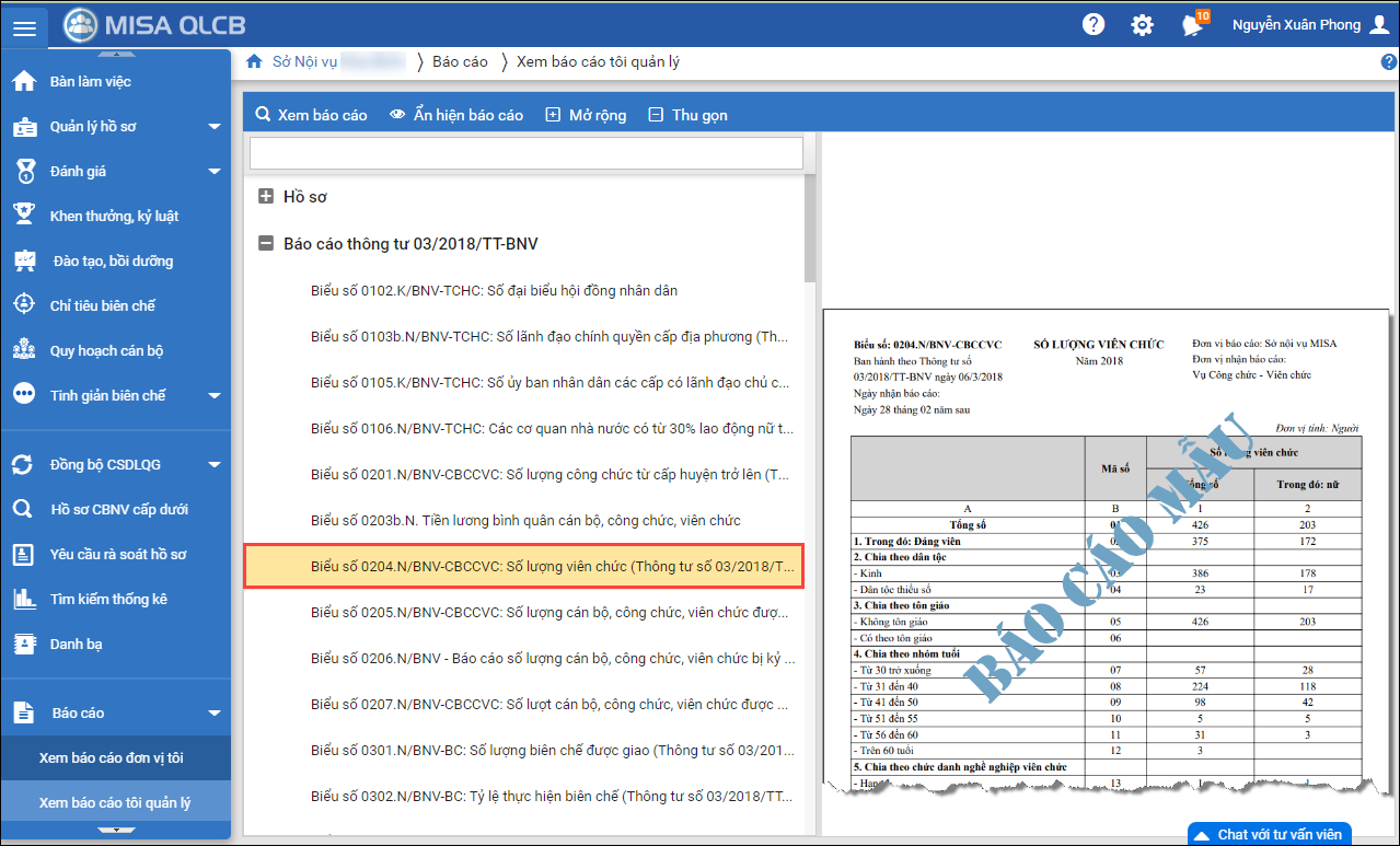 - Vào Báo cáo\Xem báo cáo tôi quản lý, tại nhóm Báo cáo thông tư 03/2018/TT-BNV: Nhấn đúp chuột tại Biểu số 0204.N/BNV-CBCCVC: Số lượng viên chức (Thông tư số 03/2018/TT-BNV)