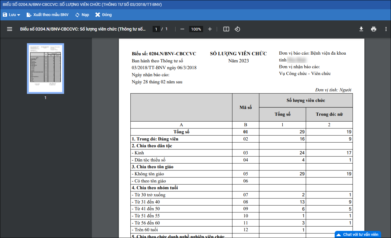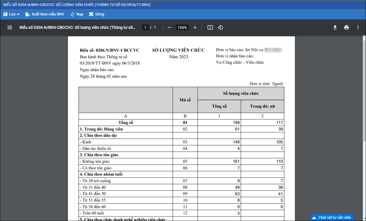Giúp in báo cáo thống kê số lượng viên chức.
