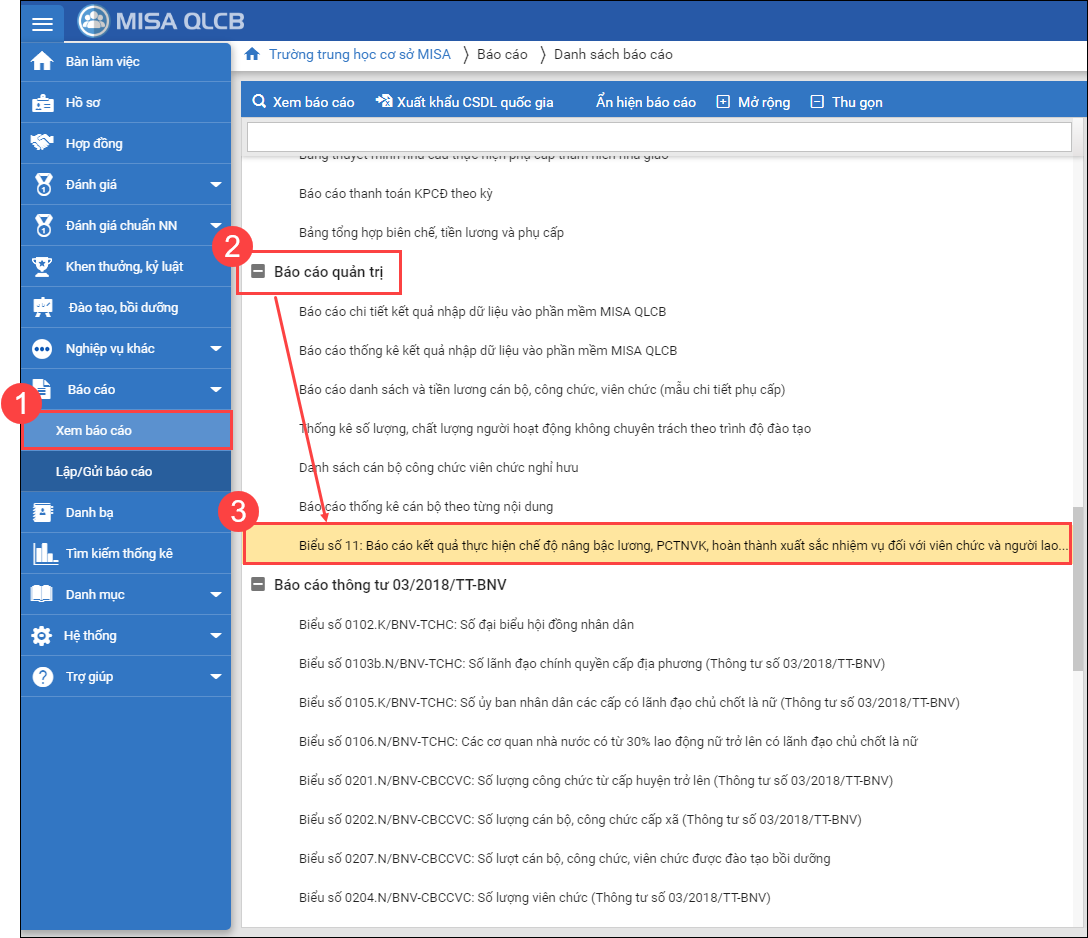 1. Tại menu Báo cáo\Xem báo cáo\Báo cáo quản trịg, phần mềm bổ sung Biểu số 11: Báo cáo kết quả thực hiện chế độ nâng bậc lương, PCTNVK, hoàn thành xuất sắc nhiệm vụ đối với viên chức và người lao động.