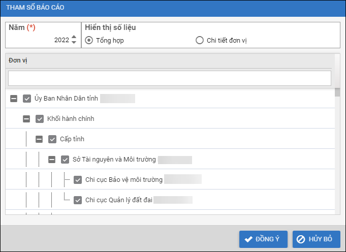 - Chọn hiển thị số liệu tổng hợp hay chi tiết đơn vị