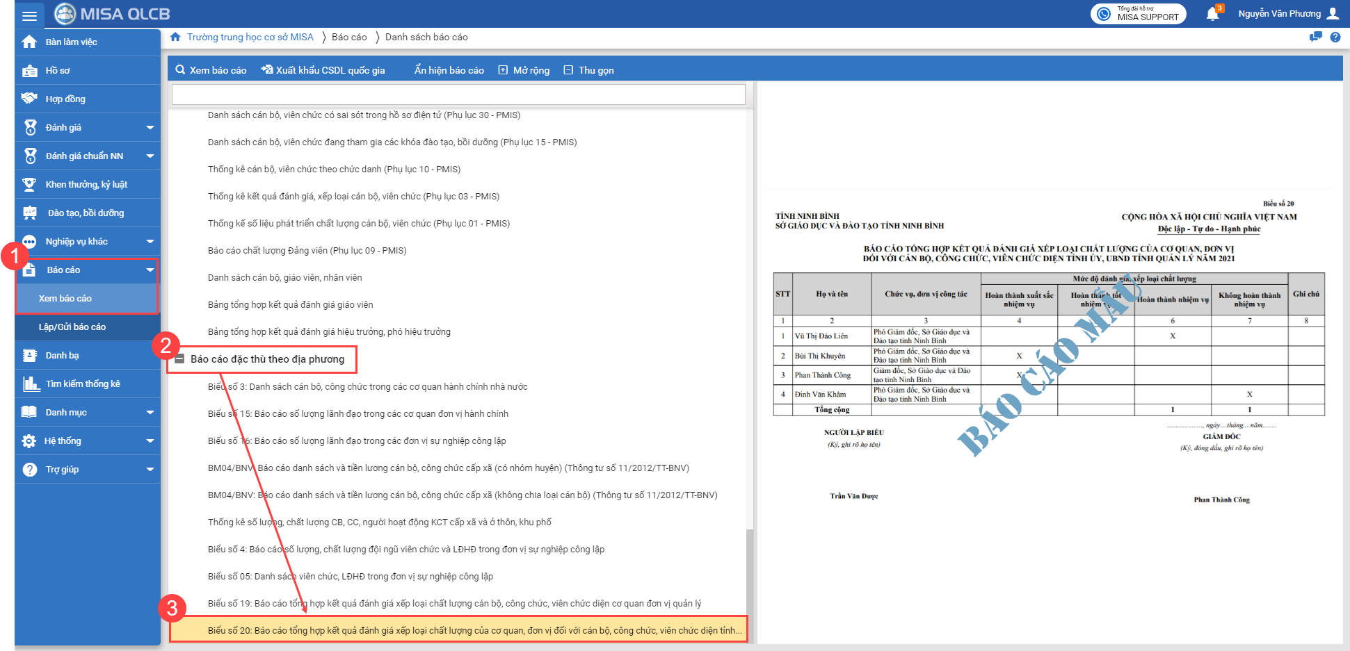 1. Tại menu Báo cáo\Xem báo cáo\Báo cáo đặc thù theo địa phương, phần mềm bổ sung Biểu số 20: Báo cáo tổng hợp kết quả đánh giá xếp loại chất lượng của coq quan đơn vị đối với cán bộ, công chức, viên chức diện tirh ủy, UBND tỉnh quản lý.