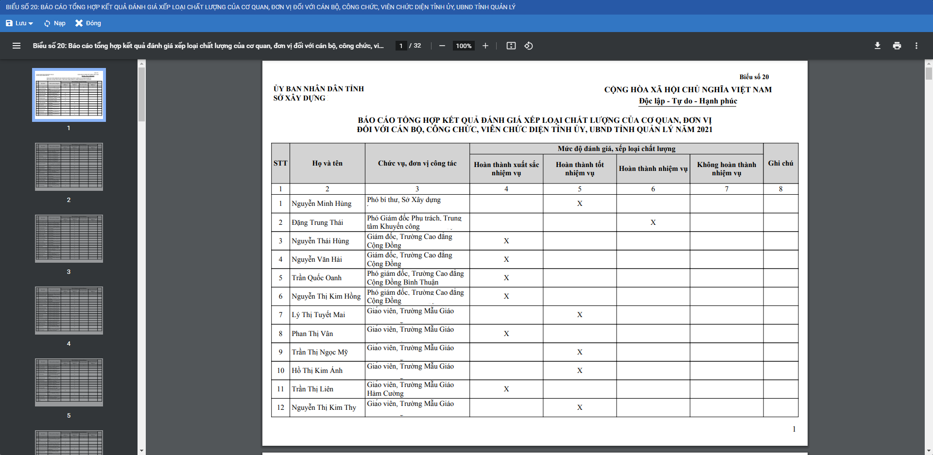 Đáp ứng Biểu số 20: Báo cáo tổng hợp kết quả đánh giá xếp loại chất lượng của coq quan đơn vị đối với cán bộ, công chức, viên chức diện tirh ủy, UBND tỉnh quản lý.