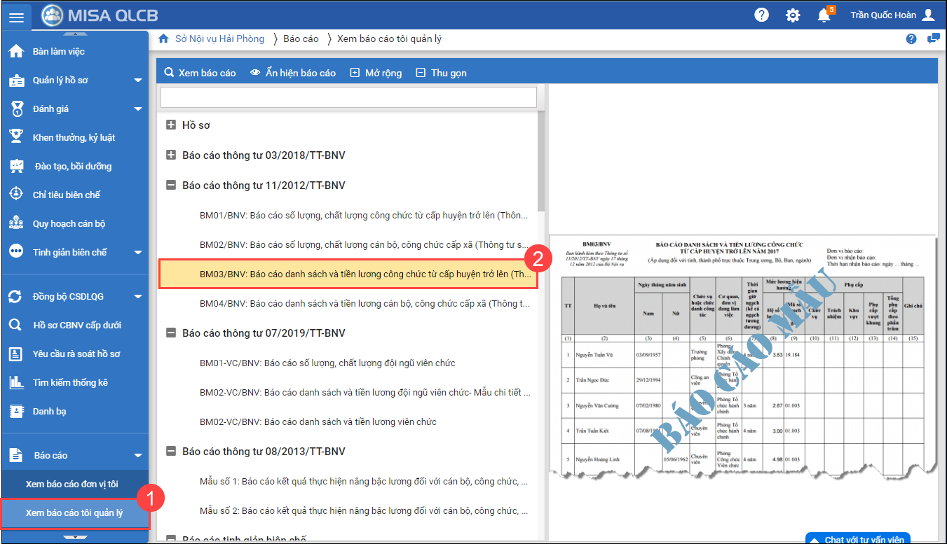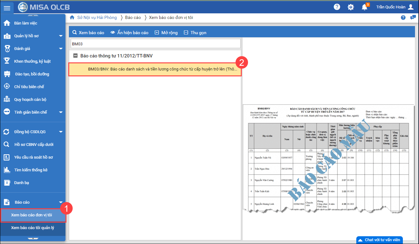 - Vào Báo cáo\Xem báo cáo tôi quản lý, tại nhóm Báo cáo Thông tư số 11/2012/TT-BNV: Nhấn đúp chuột tại BM03/BNV: Báo cáo danh sách và tiền lương cán bộ, công chức từ cấp huyện trở lên (Thông tư số 11/2012/TT-BNV)