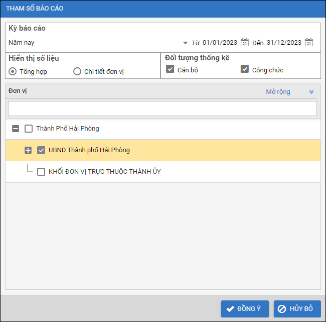 - Đơn vị: Tích chọn những đơn vị muốn thống kê cán bộ/công chức của đơn vị đó.