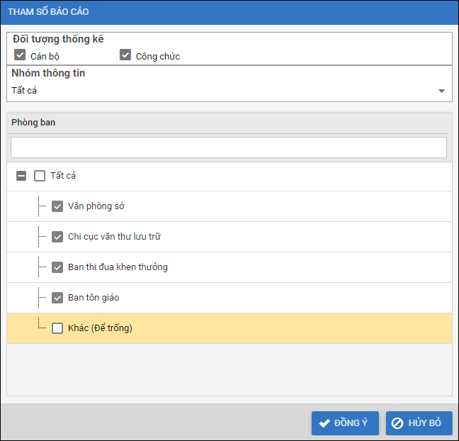 - Phòng ban: Tích chọn những phòng ban muốn thống kê cán bộ/công chức của phòng ban đó.