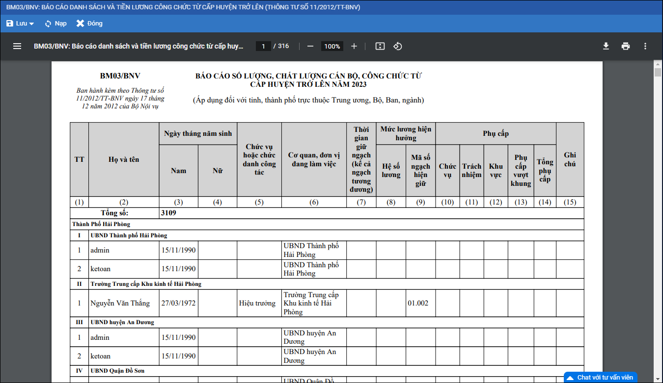 Giúp báo cáo danh sách và tiền lương công chức từ cấp huyện trở lên theo thông tư 11/2012 – BNV toàn ngành
