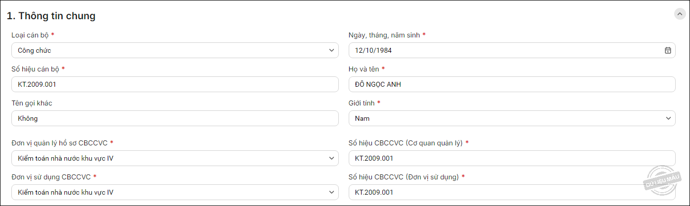 - Số hiệu CBCCVC (Đơn vị sử dụng): Nhập mã số hiệu của CBCCVC tại đơn vị sử dụng.
