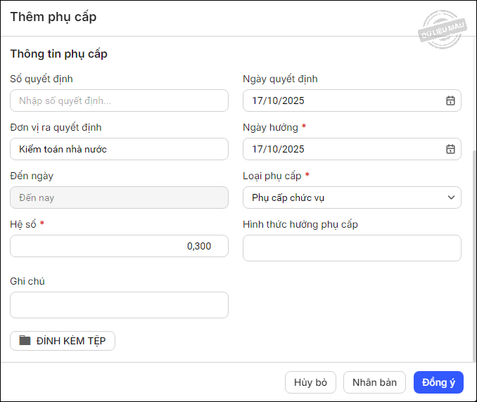 - Ngày hưởng: Nhập ngày tháng năm bắt đầu hưởng phụ cấp.