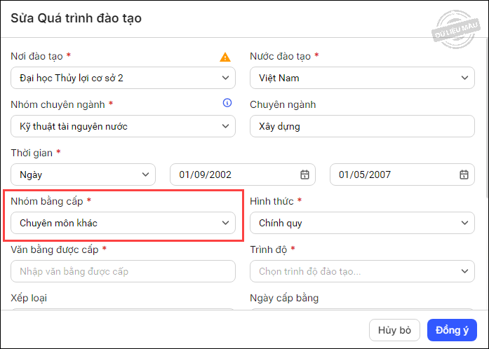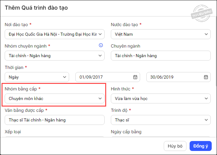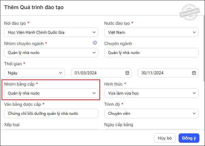 - Văn bằng được cấp: Nhập văn bằng, chứng chỉ được cấp sau khóa đào tạo.