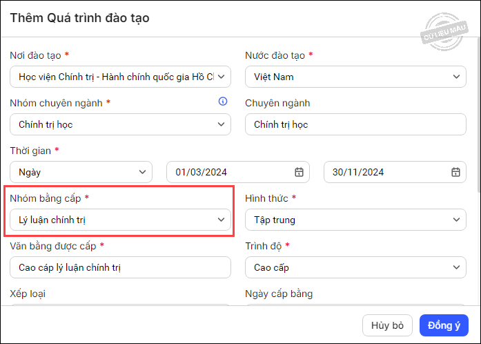 Anh/chị kiểm tra Quá trình đào tạo, không chọn giá trị Lý luận chính trị và Đào tạo bồi dưỡng, anh/chị học chuyên ngành có thể chọn sang Chuyên môn khác.
