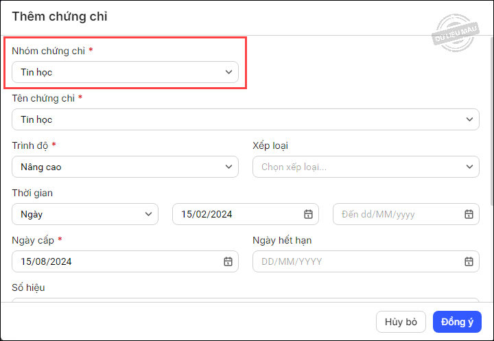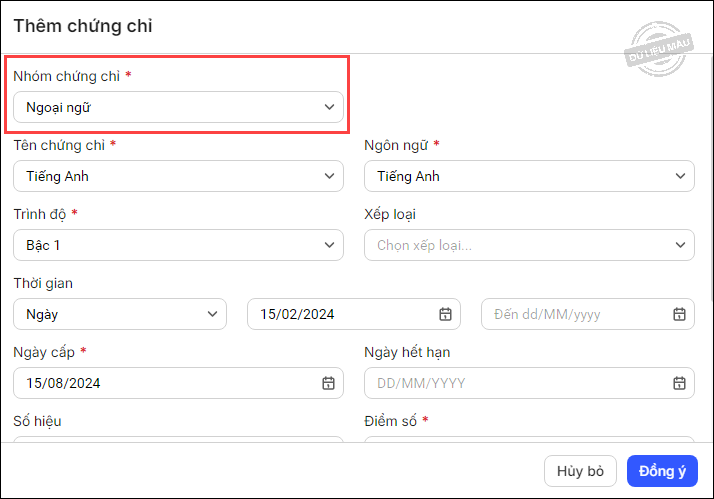 - Điểm số: Nhập điểm số nếu Nhóm chứng chỉ là Ngoại ngữ.