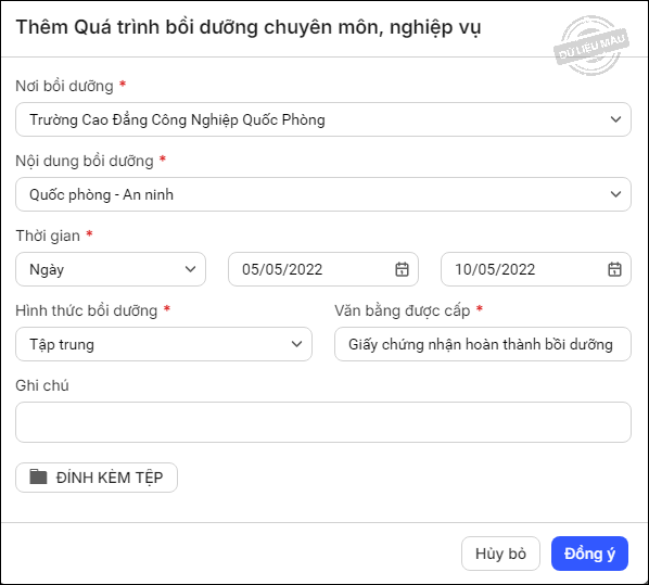 - Thời gian: Nhập ngày tháng năm của khóa đào tạo, bồi dưỡng.