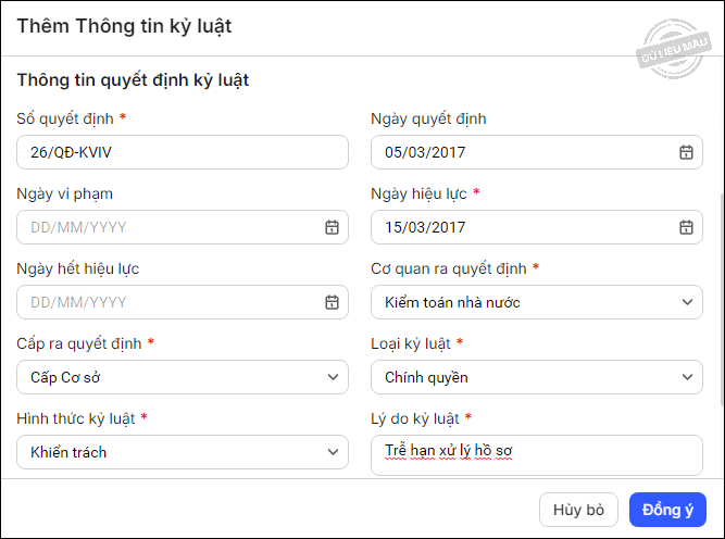 - Ngày hiệu lực: Nhập ngày tháng năm quyết định kỷ luật có hiệu lực.