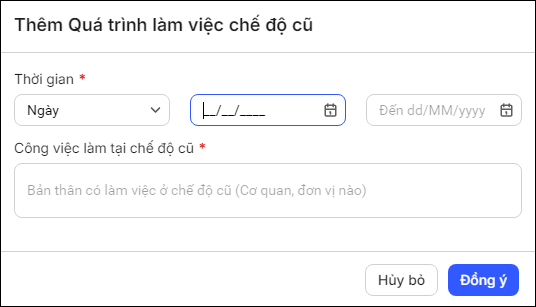 - Thời gian: Nếu có, nhập ngày tháng năm làm việc cho chế độ cũ (Từ ngày… Đến ngày…)