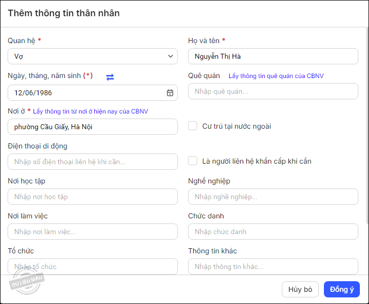- Quan hệ: Chọn từ danh sách trên phần mềm.