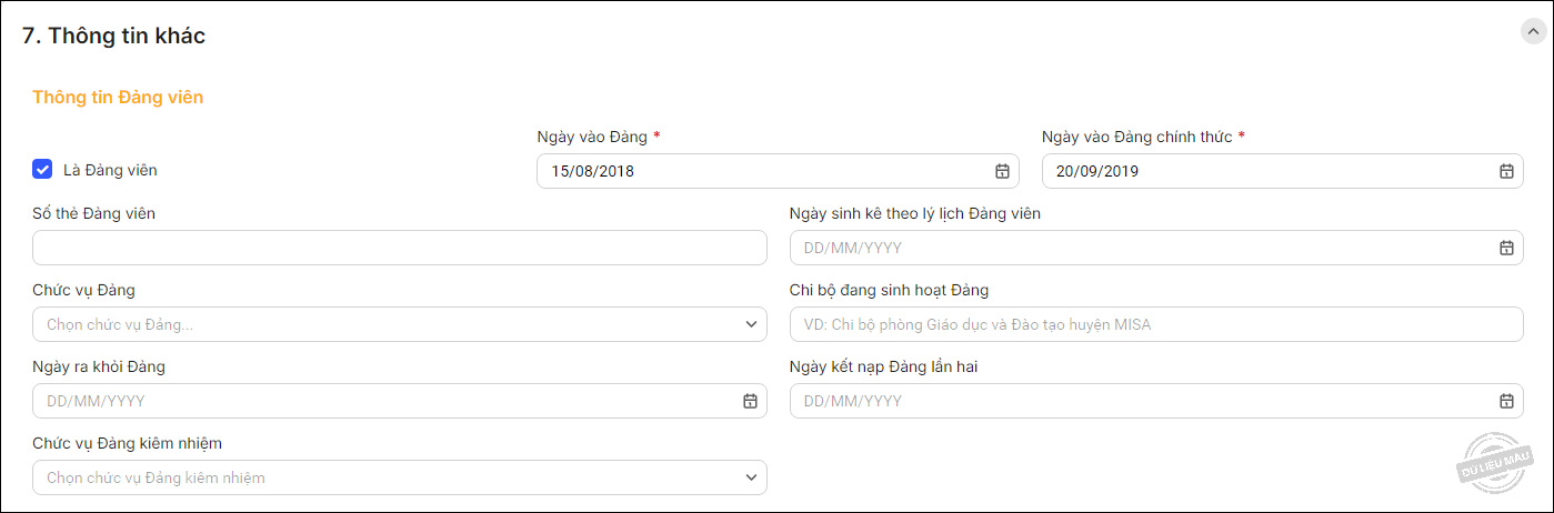 - Ngày vào Đảng chính thức: Nhập ngày tháng năm vào Đảng chính thức theo quyết định công nhận chính thức.