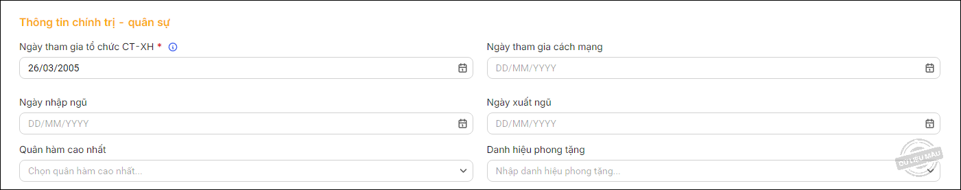 - Ngày tham gia tổ chức CT – XH: Nhập ngày tháng năm tham gia tổ chức CT – XH đầu tiên (Đoàn thanh niên, Công đoàn, Hội phụ nữ,…)