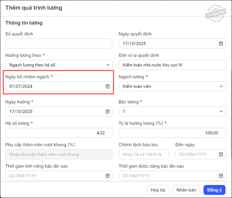 - Ngày bổ nhiệm ngạch: Nhập ngày tháng năm được bổ nhiệm ngạch lương.