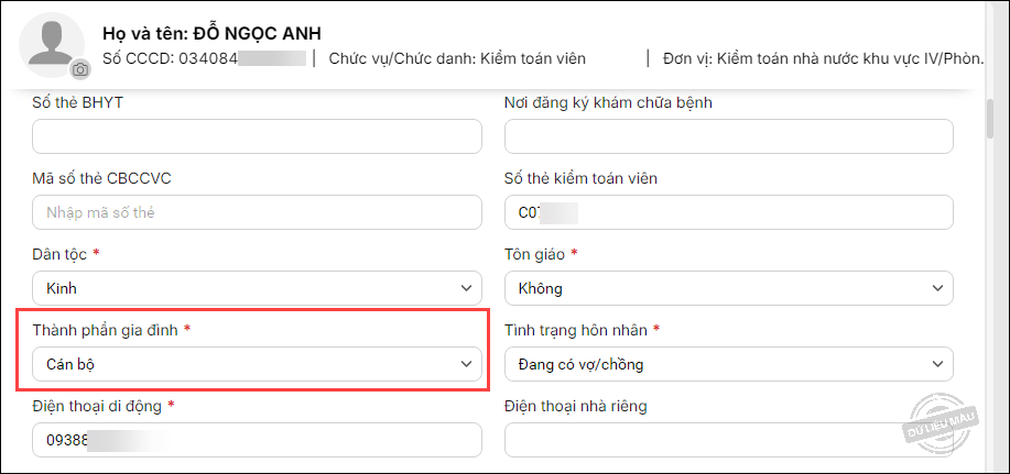 - Thành phần gia đình: Chọn phân loại trên phần mềm.