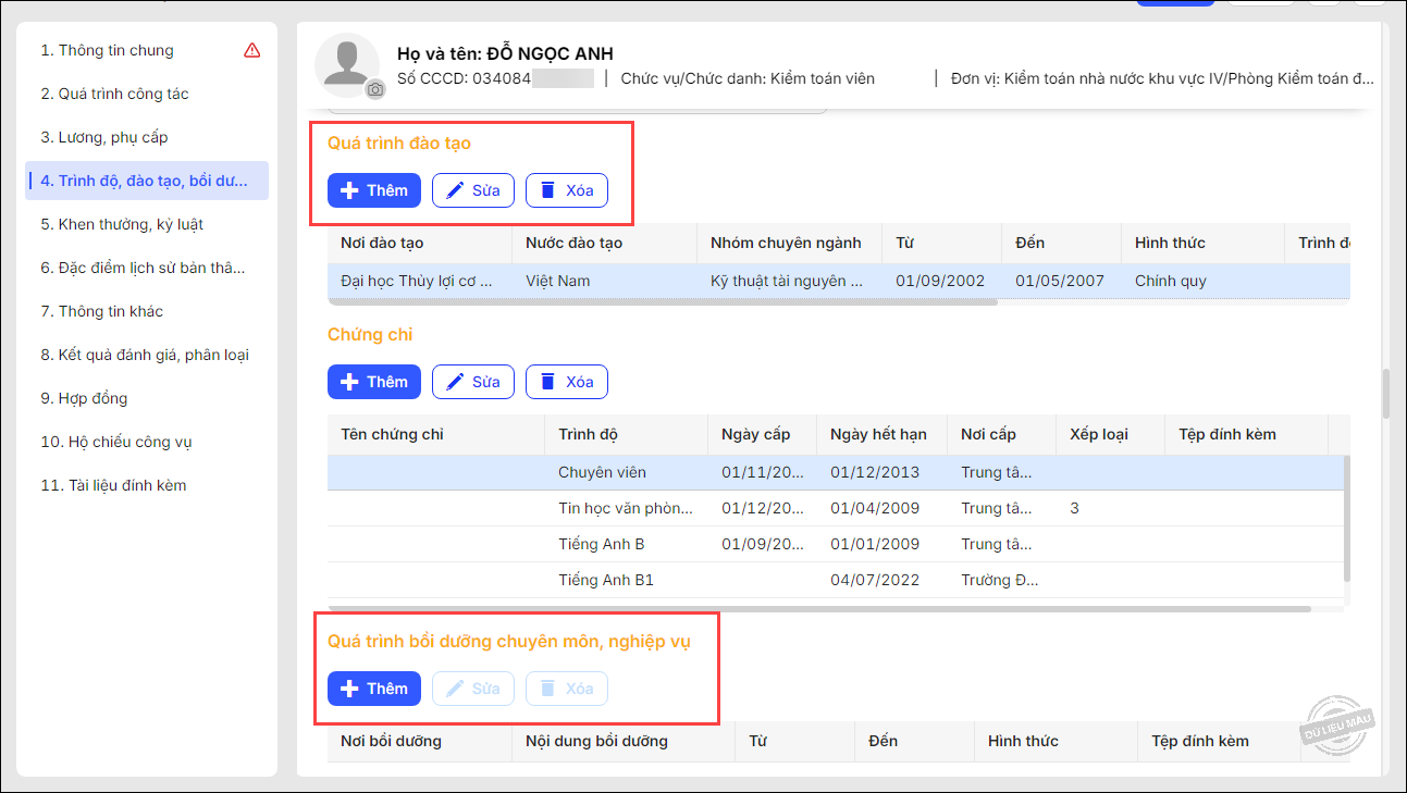 Anh/chị kiểm tra các bản ghi 2 nhóm thông tin: Quá trình đào tạo và Quá trình bồi dưỡng chuyên môn, nghiệp vụ, nhập đủ thông tin Văn bằng được cấp.