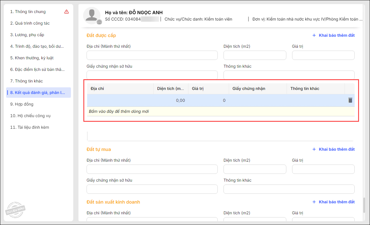 Anh/chị chọn vào vào các mục khai báo thêm đất, nếu thấy có các dòng trống ở dưới thì xóa các dòng này đi và lưu lại hồ sơ.