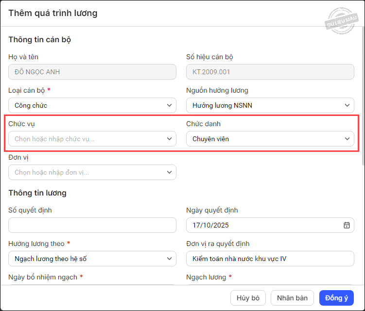 - Chức danh: Chọn chức danh trong danh sách trên phần mềm.