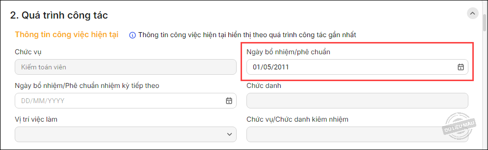 - Ngày bổ nhiệm/phê chuẩn: Nếu có khai báo thông tin Chức vụ thì bắt buộc nhập ngày tháng năm được bổ nhiệm.