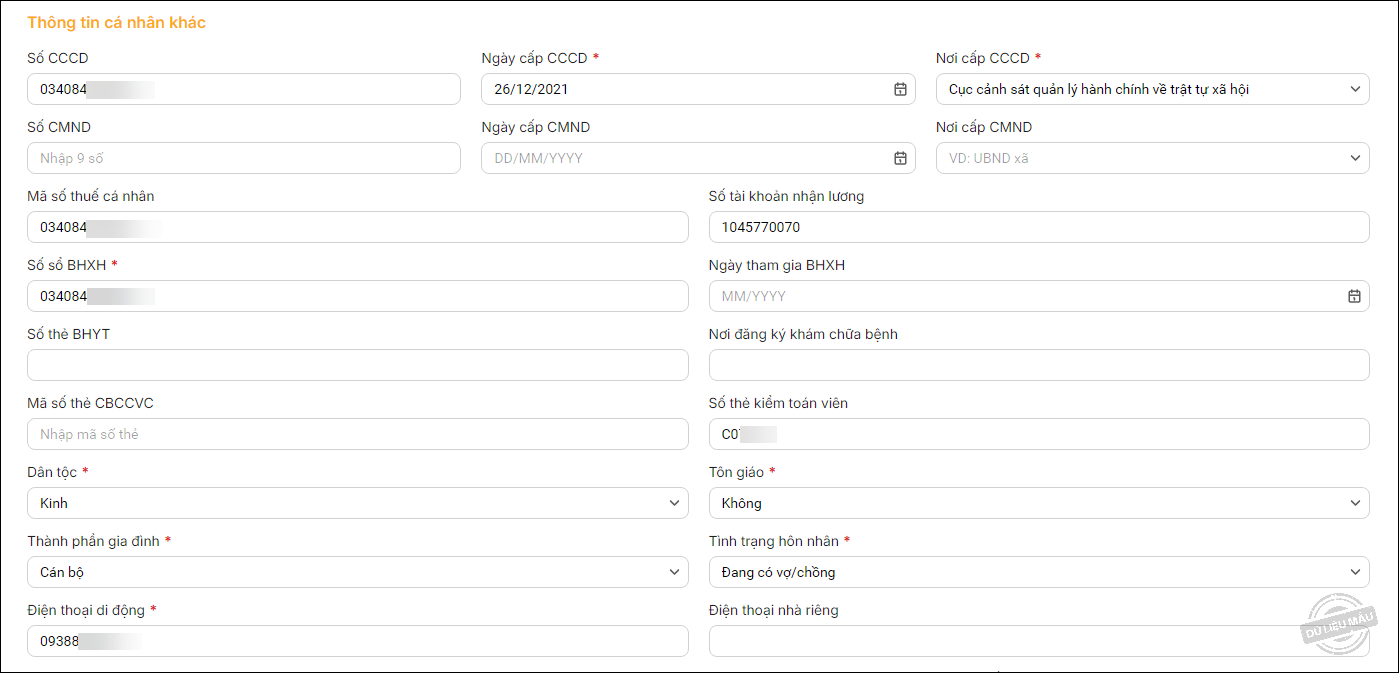 - Dân tộc: Chọn trong danh sách trên phần mềm.