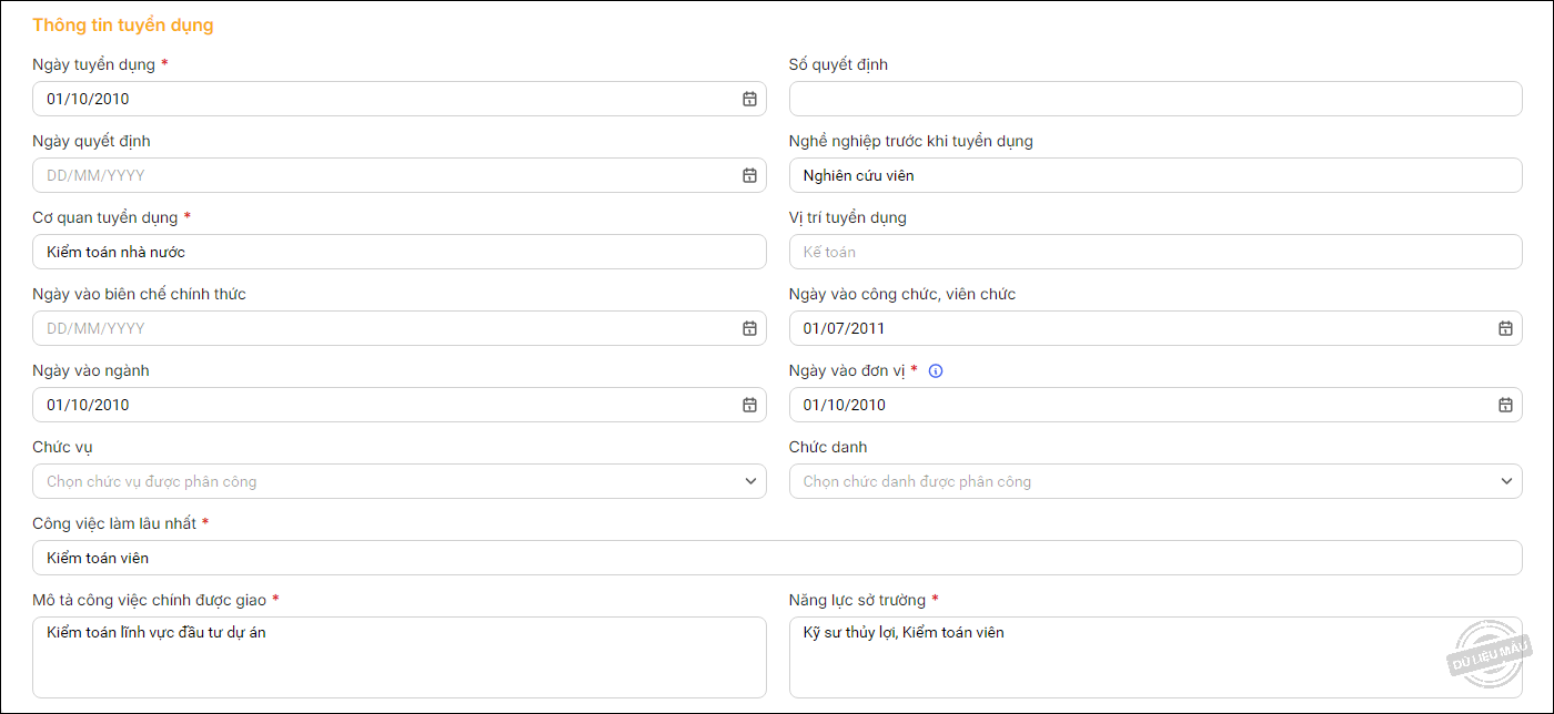 - Ngày tuyển dụng: Nhập ngày tháng năm tuyển dụng lần đầu vào cơ quan nhà nước.