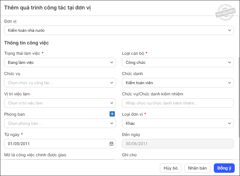 - Từ ngày: Nhập ngày tháng năm bắt đầu công tác tại đơn vị.