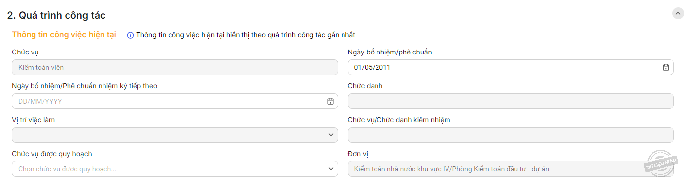 Anh/chị kiểm tra thông tin Ngày bổ nhiệm/phê chuẩn trong Quá trình công tác/Thông tin công việc hiện tại.