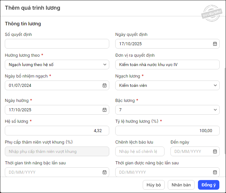 - Ngày hưởng: Nhập ngày tháng năm bắt đầu hưởng lương tại đơn vị.