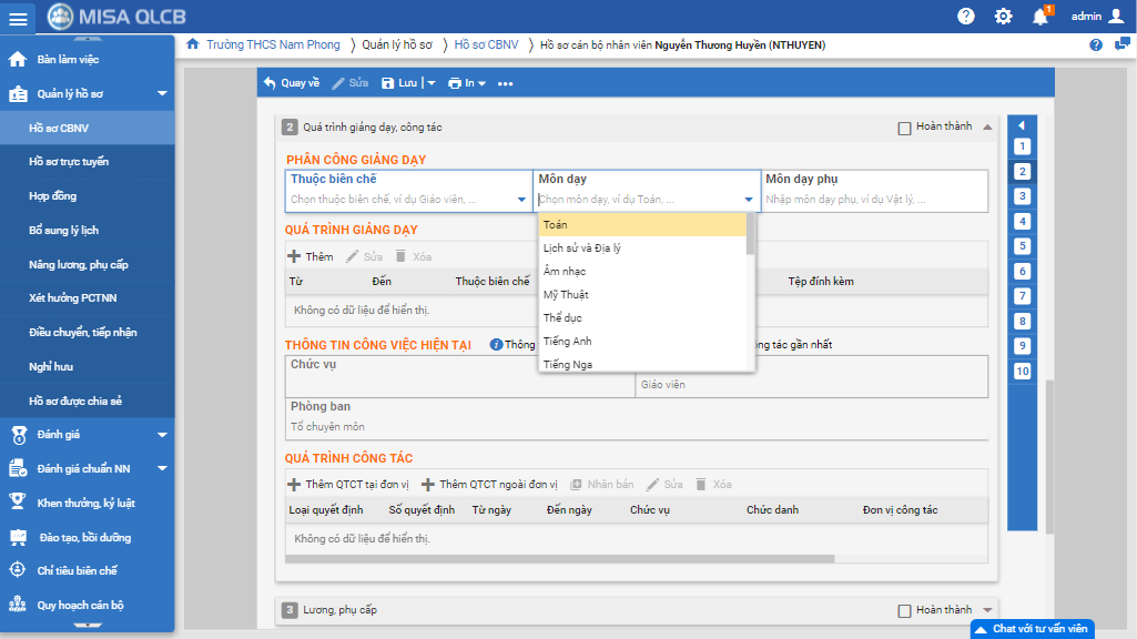 - Vào Menu/Hồ sơ CBNV, đối với hồ sơ của các giáo viên, tại phần Phân công giảng dạy, anh chị có thể xác định giáo viên đó đang được phân công phụ trách giảng dạy môn học nào. Danh sách các môn học mang đi đã đáp ứng theo quy định tại thông tư 32/2018/TT-BGDĐT