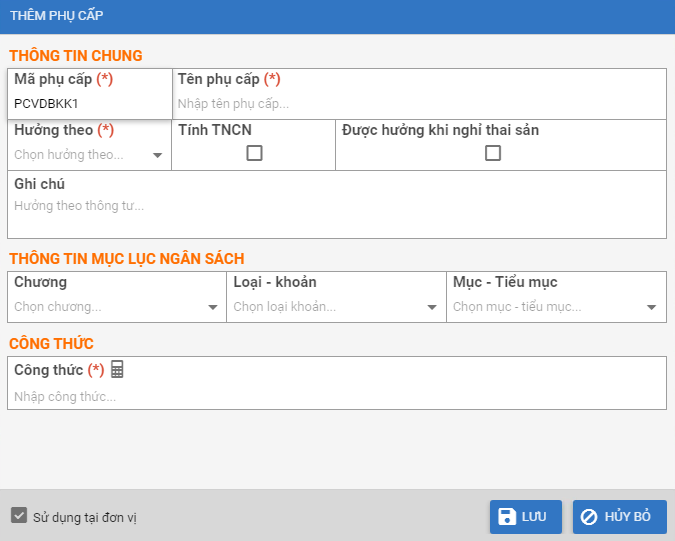 - Tích chọn Sử dụng tại đơn vị nếu đơn vị muốn áp dụng khoản phụ cấp này cho đơn vị của mình