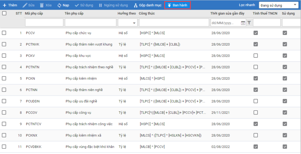 - Từ phiên bản R57, các đơn vị trực thuộc không thể tự thêm, sửa, xóa danh mục phụ cấp, chỉ sử dụng/không sử dụng danh mục do cấp trên ban hành