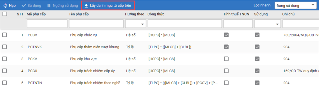 2. Ngoài ra, đơn vị trực thuộc có thể vào Danh mục/Phụ cấp, nhấn Lấy danh mục từ cấp trên để thực hiện đồng bộ danh mục.