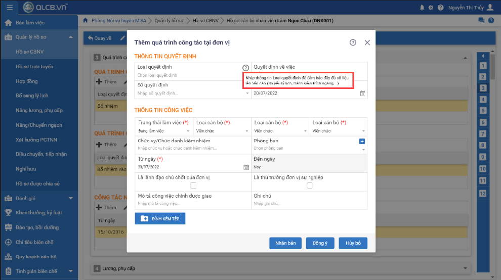 - Khi khai báo quá trình công tác, thông tin Loại quyết định sẽ đi kèm với hướng dẫn như dưới đây.