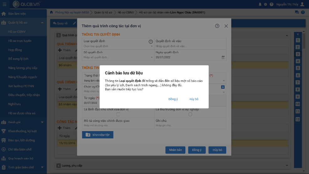 - Từ phiên bản R57: Cán bộ tổ chức sẽ được hướng dẫn khi không nhập thông tin loại quyết định sẽ ảnh hưởng đến các báo cáo không lên đầy đủ các thông tin
