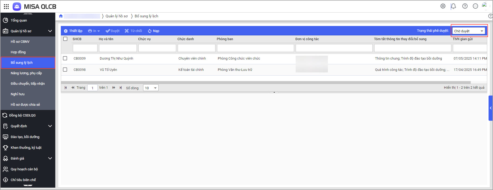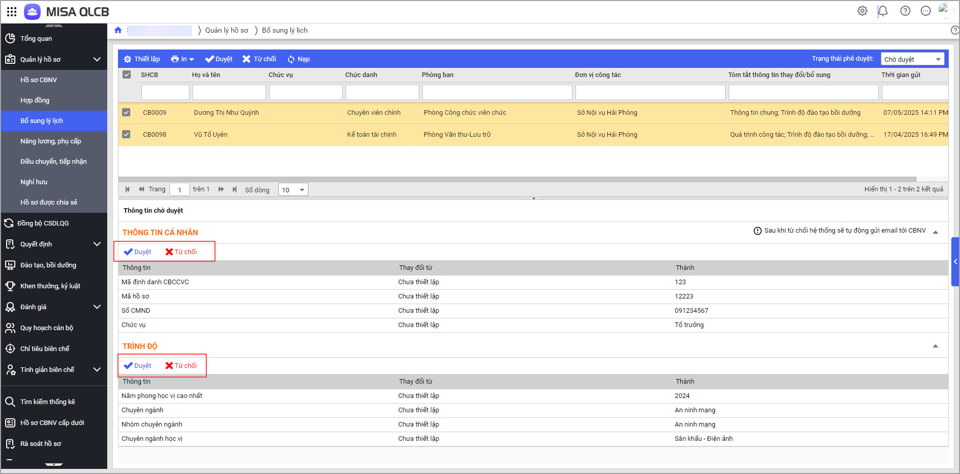 Tại menu Quản lý hồ sơ\Bổ sung lý lịch: với các hồ sơ CBNV có trạng thái chờ duyệt,
