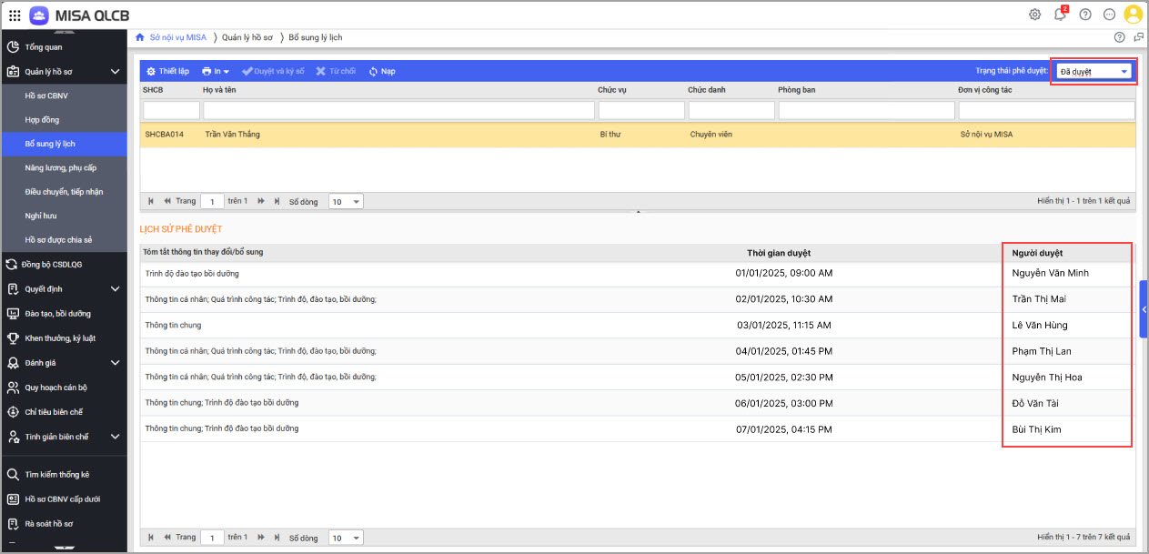 Với các hồ sơ đã duyệt, phần mềm hiển thị thêm cột Người duyệt, giúp CBTC biết ai là người đã phê duyệt hồ sơ.