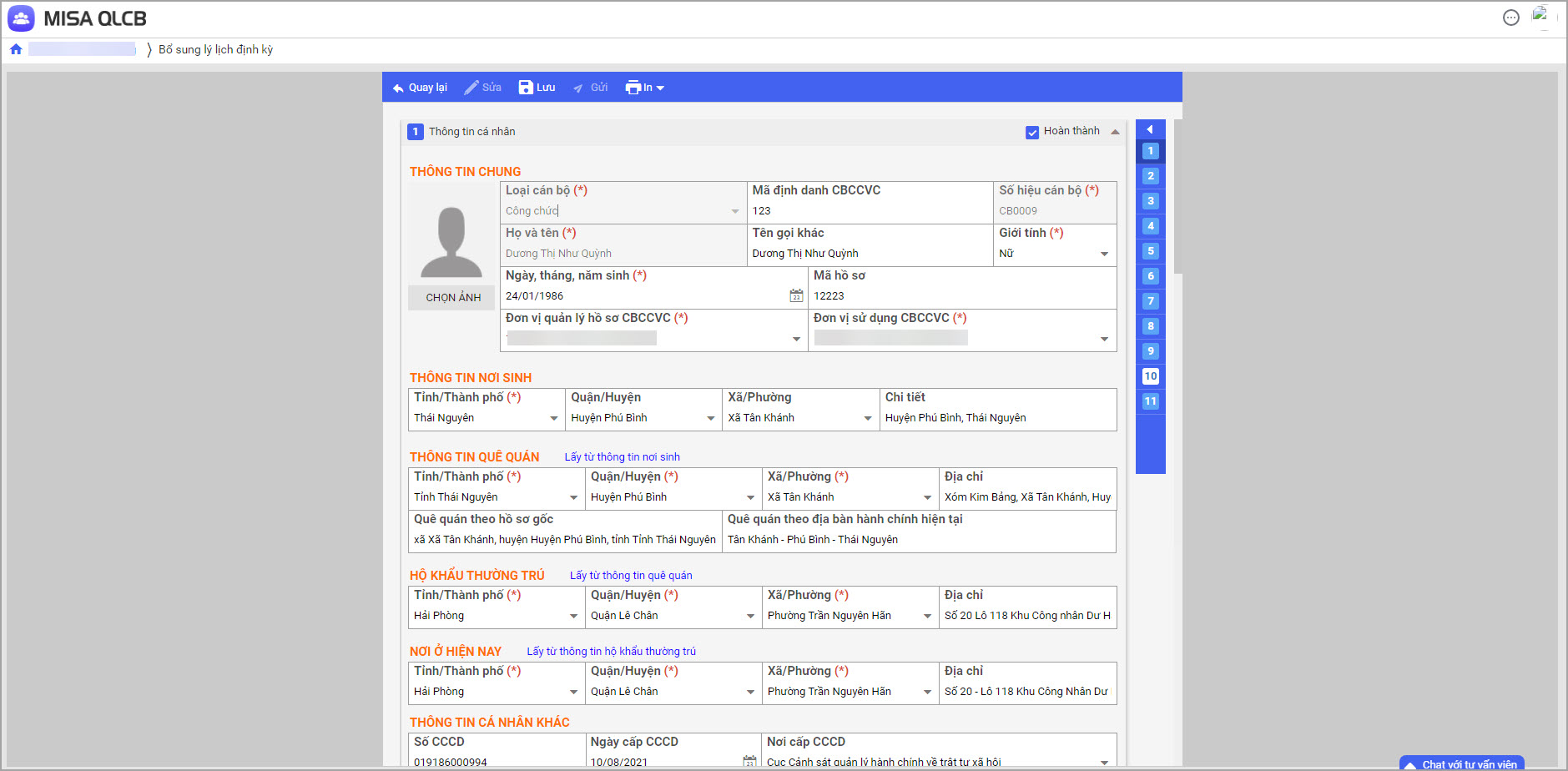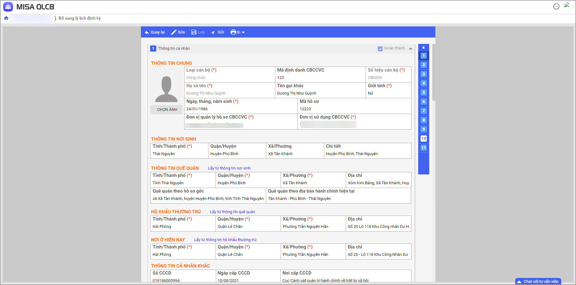 Khi CBNV xem hồ sơ, các trường thông tin sẽ hiển thị trên nền trắng.