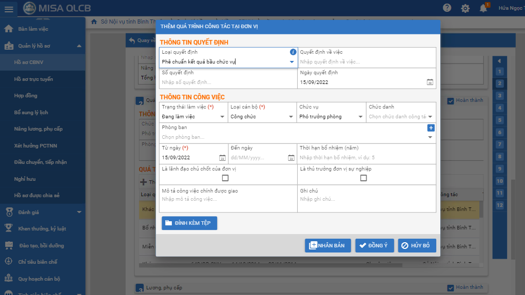 - Tại phần Quá trình công tác/Thêm quá trình công tác, anh chị chọn Loại quyết định là Phê chuẩn kết quả bầu chức vụ