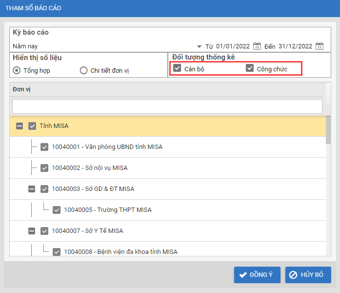 - Tại bảng tham số, Chọn đối tượng thống kê là Cán bộ hoặc Công chức hoặc cả 2