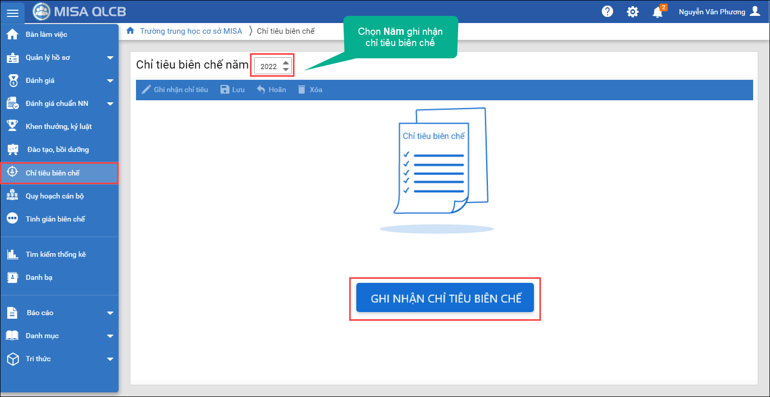 - Vào menu Chỉ tiêu biên chế, chọn Năm ghi nhận chỉ tiêu biên chế và nhấn Ghi nhận chỉ tiêu biên chế.