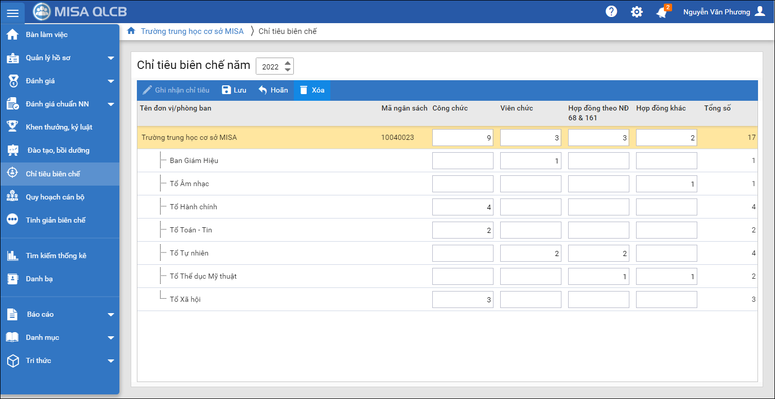 - Nhấn Cất. Nếu có thay đổi phòng ban và muốn cập nhật lại thì thực hiện xóa bảng chỉ tiêu biên chế của năm tương ứng bằng cách nhấn Xóa. Sau đó lập lại bảng chỉ tiêu biên chế.