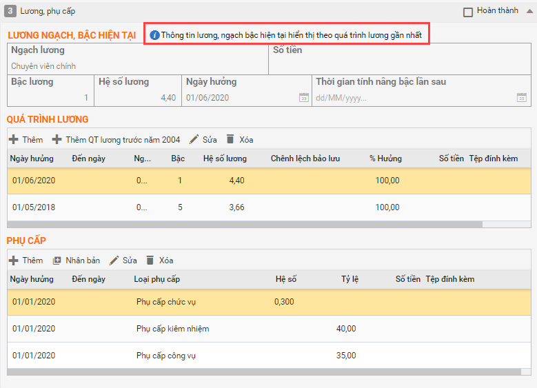 - Từ phiên bản R57: “Thông tin công việc hiện tại” được đổi thành “Thông tin lương, ngạch bậc hiện tại hiển thị theo quá trình lương gần nhất”