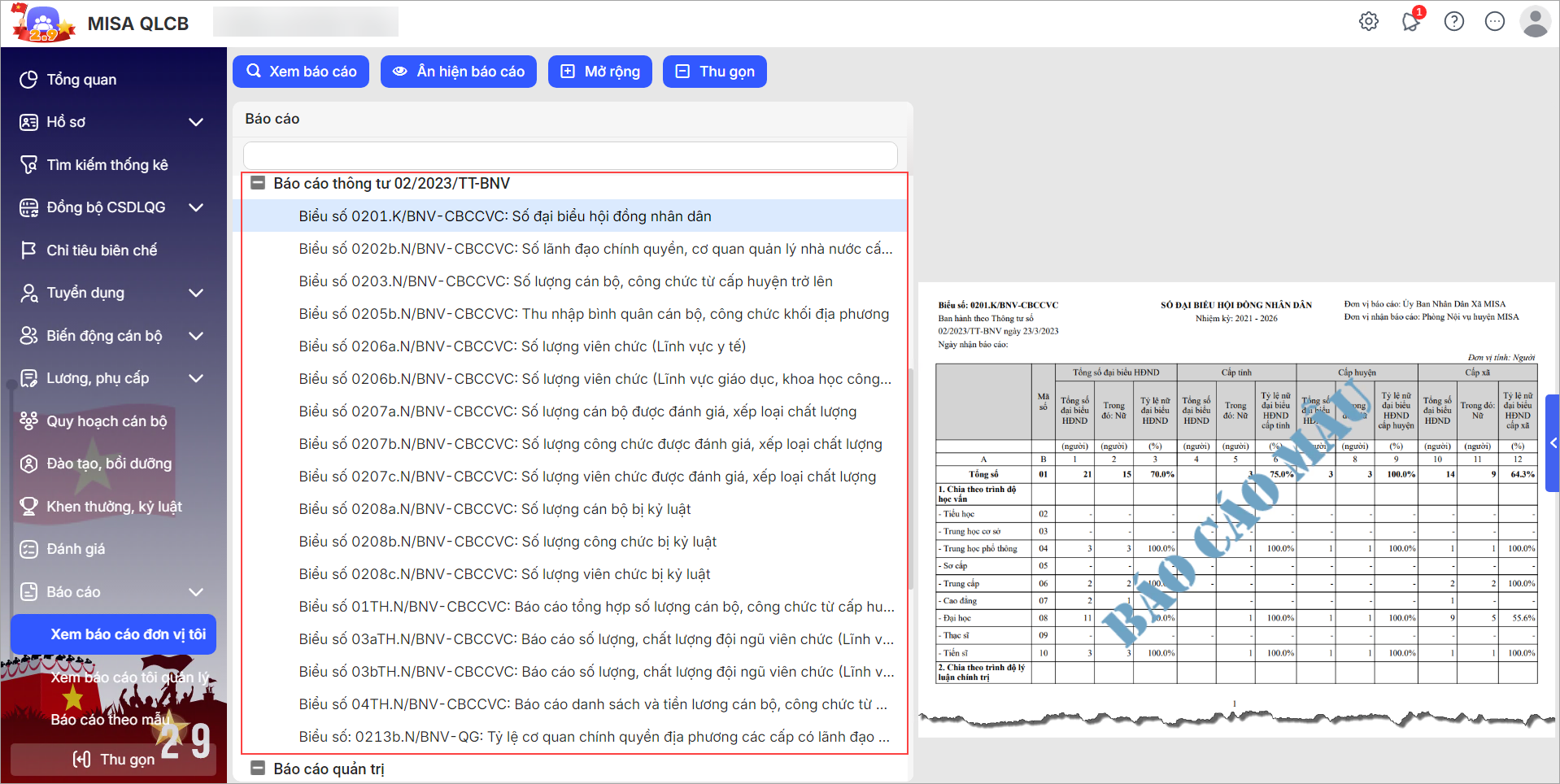 - Biểu số 0203.N/BNV-CBCCVC: Số lượng cán bộ, công chức từ cấp huyện trở lên